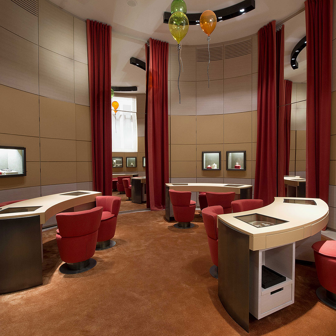 The pure lines and curved shapes combine to create resolutely modern spaces that enhance the essential, sculptural forms of Vhernier jewelry.