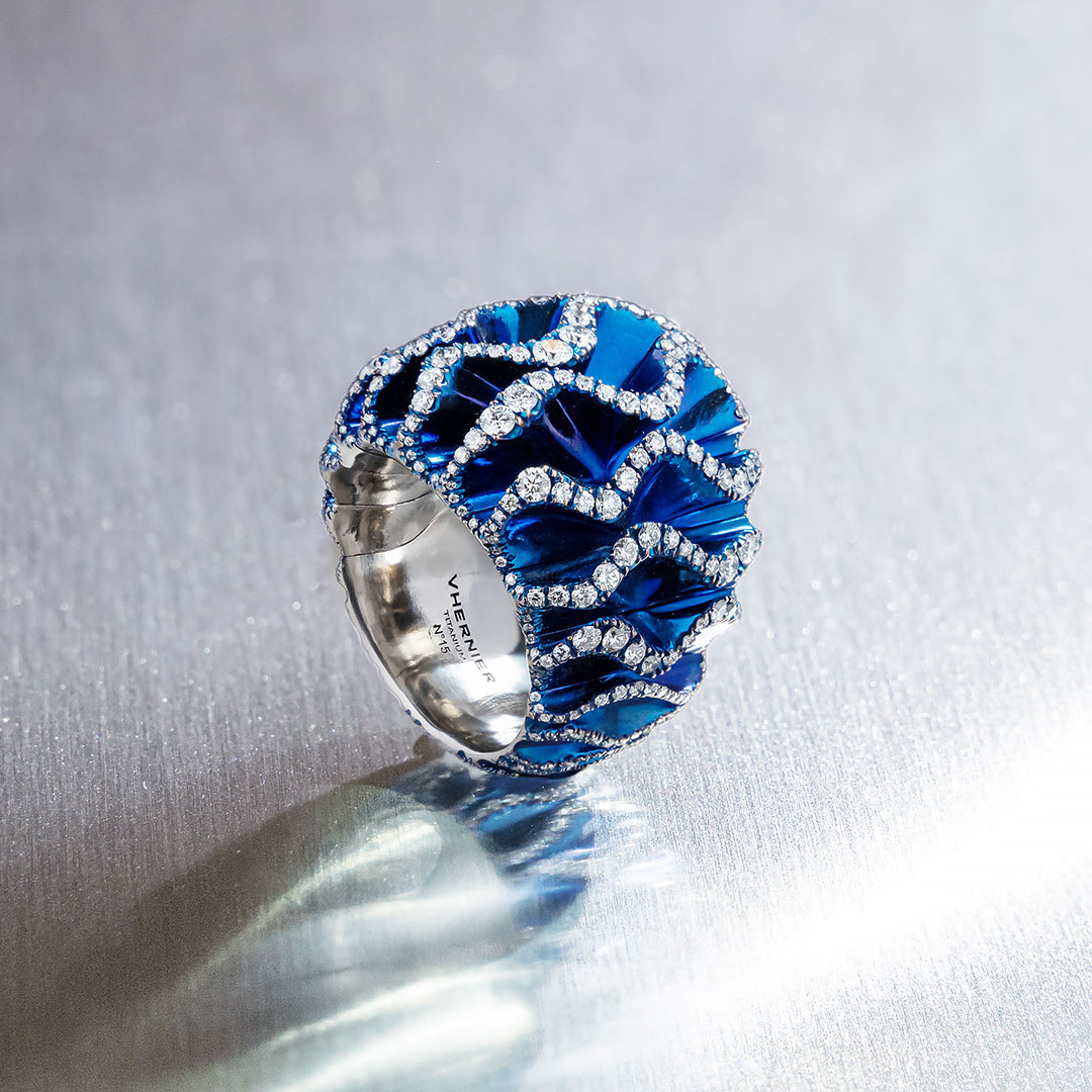 In many cases Vhernier uses such materials in absolutely new ways: for example, coloring titanium, curving it into subtle and perfectly regular waves, giving it bold volumes that accommodate diamonds set with only two prongs.