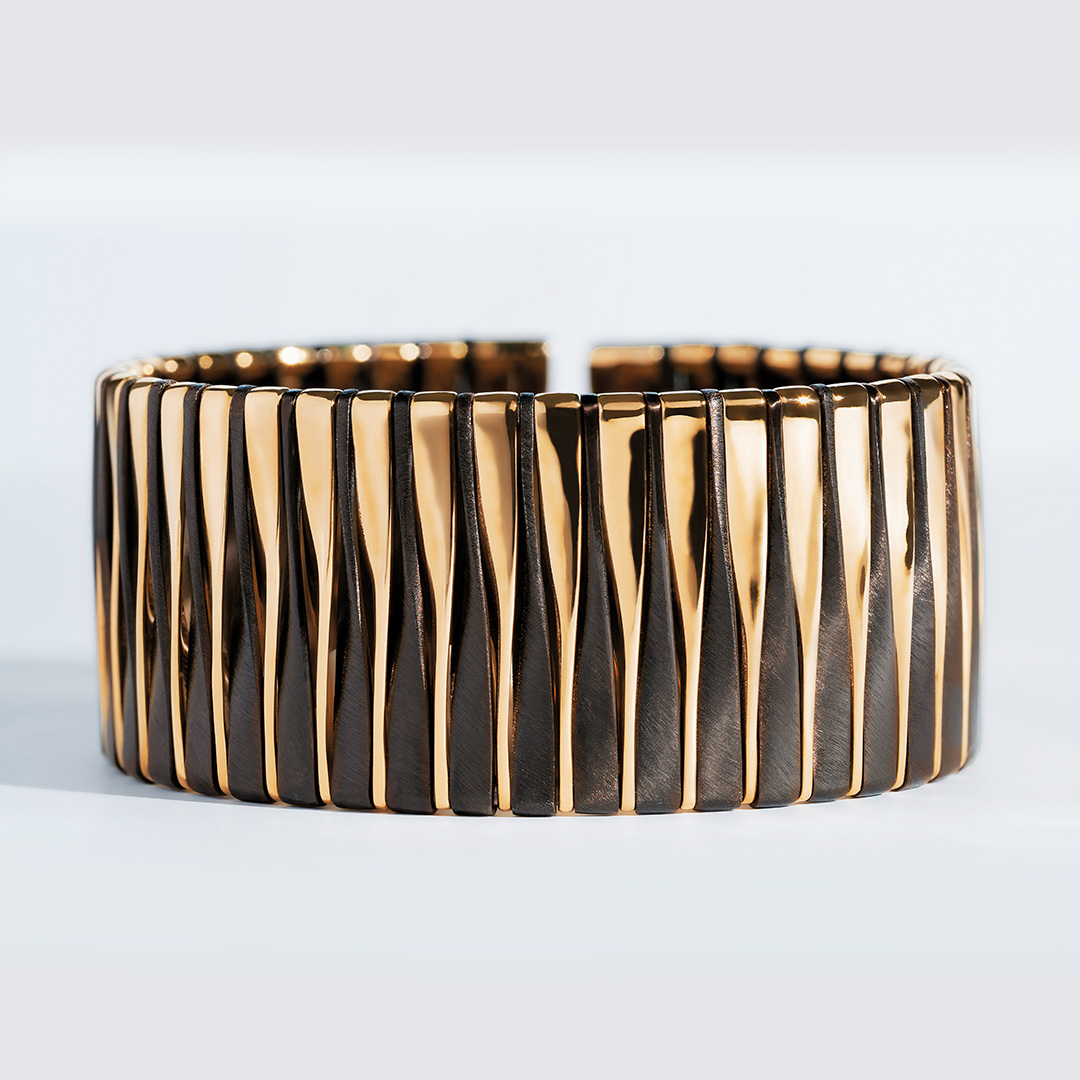 Vhernier was a forerunner in the use of titanium, extreme and enigmatic, while bronze was chosen because of its lightness. Aluminum allows for unique color nuances that, combined with gold, exemplify the Milanese understatement that is one of the hallmarks of the house.
